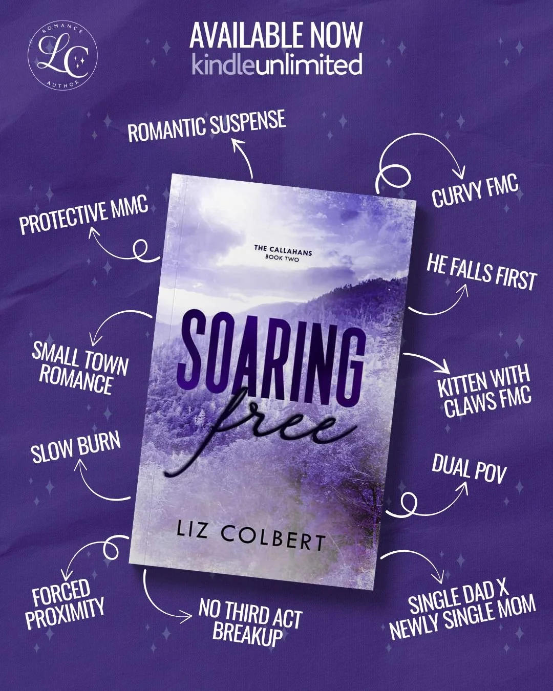 Soaring Free is a slow burn romantic suspense novel featuring a newly single mom heroine, a playful yet protective single dad that falls first, unexpected twists and turns, and a guaranteed happily ever after. This dual POV book includes adult themes and language. The Callahans is a series of interconnected standalone novels but best enjoyed if read in order.