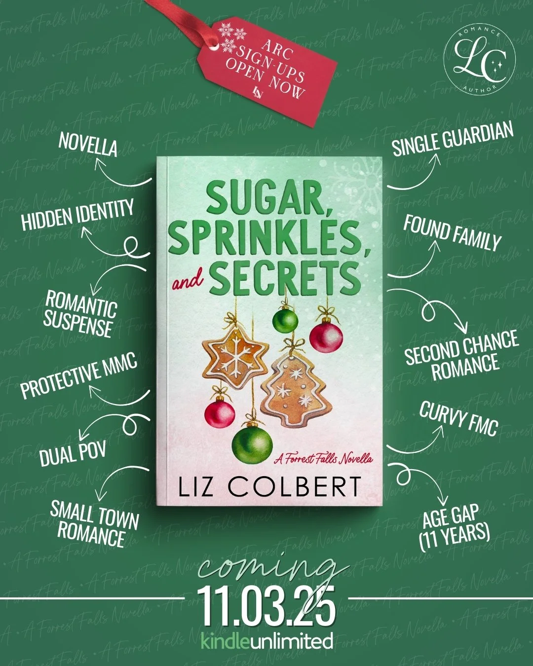 This holiday season, Sugar, Sprinkles, and Secrets will unwrap unexpected twists and turns for readers in this dual POV novella featuring a single guardian, age gap (eleven years), found family, and a guaranteed happily ever after. This independent spinoff novella falls between books two and three of Liz Colbert’s series The Callahans.